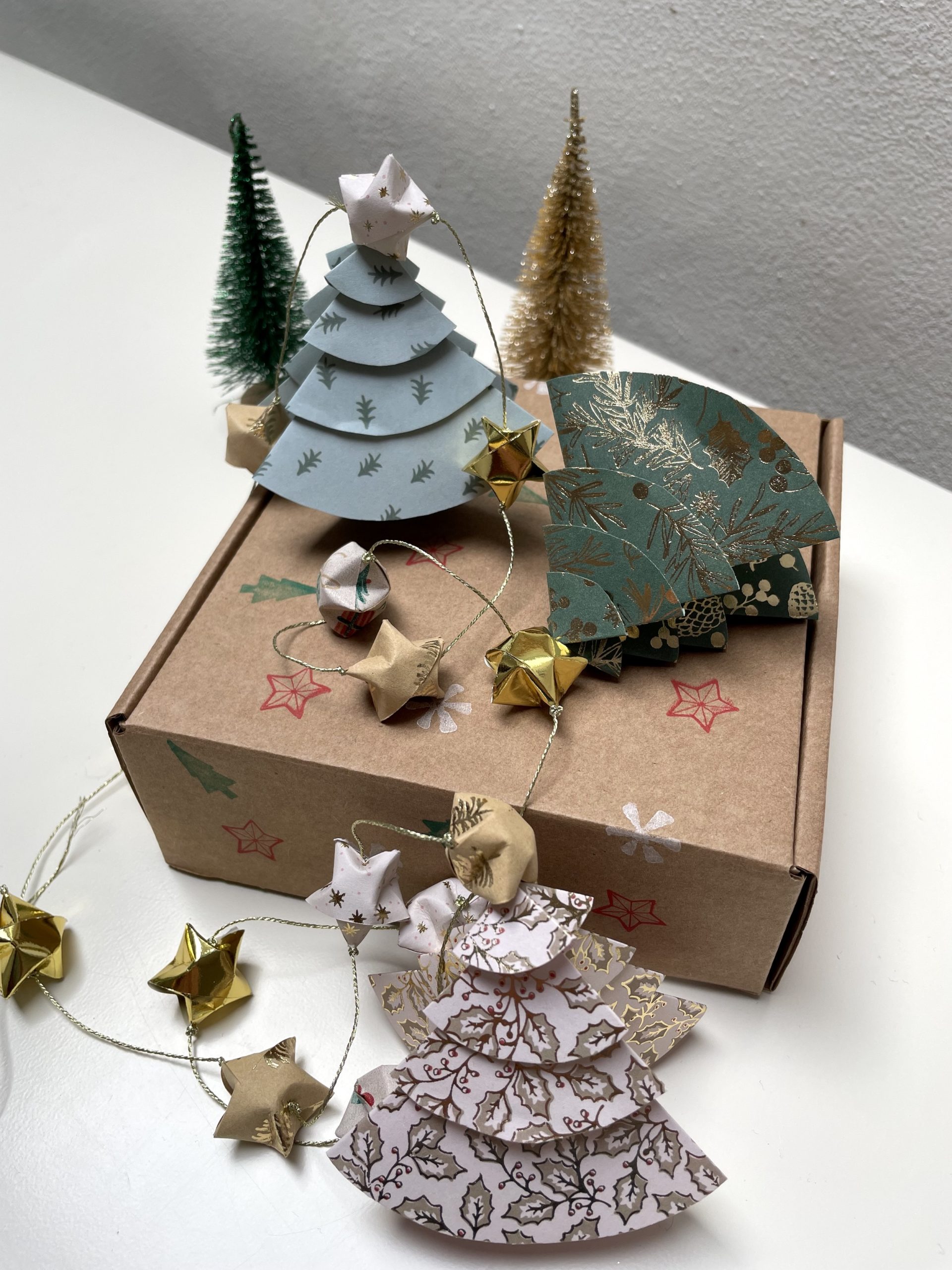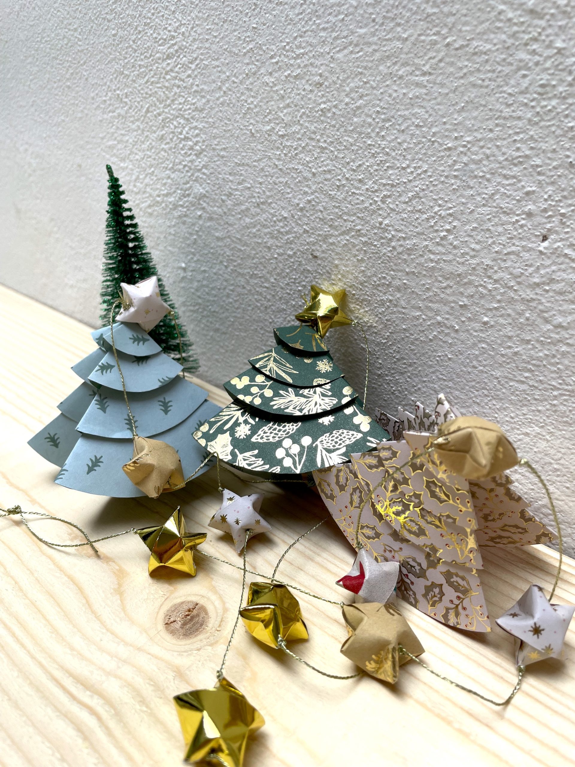 Petite «guirlande sapins » avec étoiles en origami et sapins.