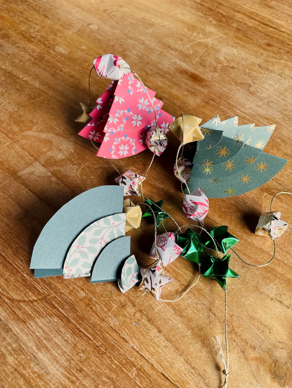 Petite «guirlande sapins » avec étoiles en origami et sapins. environ 100cm de longueur