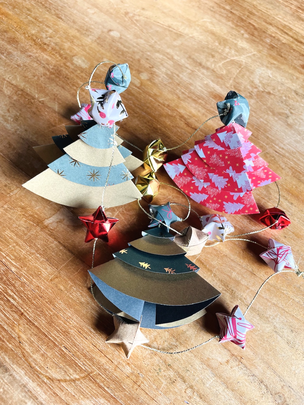 Petite «guirlande sapins » avec étoiles en origami et sapins. environ 100cm de longueur