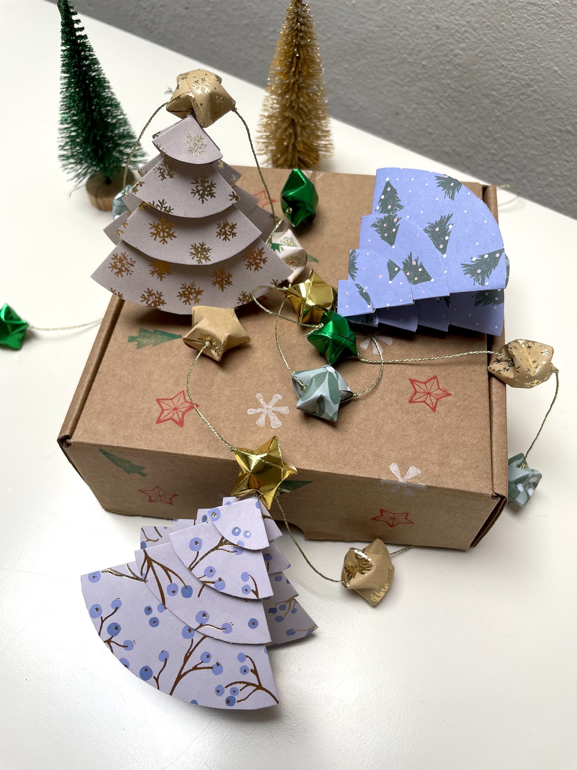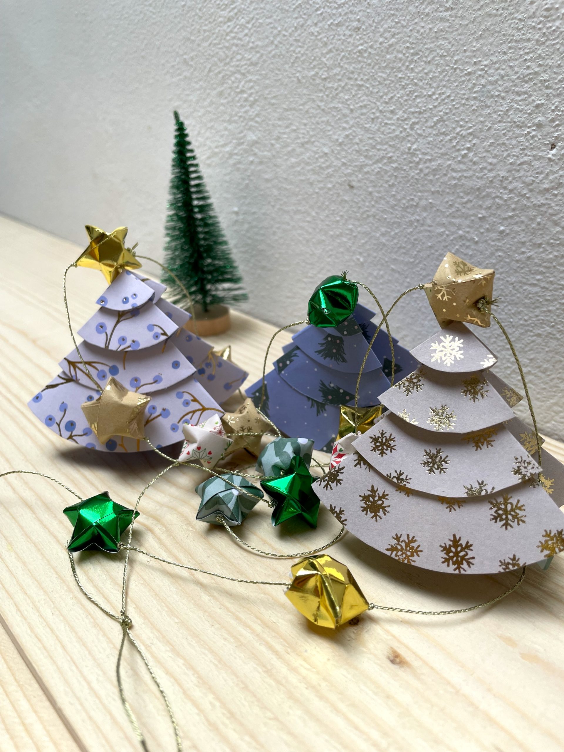 Petite «guirlande sapins » avec étoiles en origami et sapins.